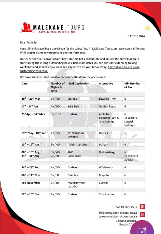 Email: info@malekanetours.co.za
